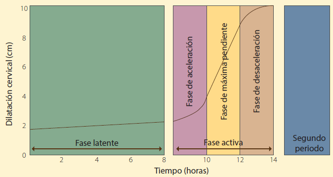 Periodo de dilatación. Es el intervalo entre la aparición de las contracciones y la dilatación completa del cuello del útero (10 cm). El periodo de dilatación se divide a su vez en 2 fases: la fase latente que comprende el borramiento y la dilatación inicial del cuello del útero hasta antes de los 3 cm: y la fase activa, durante la cual se produce una dilatación más rápida del cuello del útero, que suele iniciarse aproximadamente a partir de los 3 centímetros de dilatación.