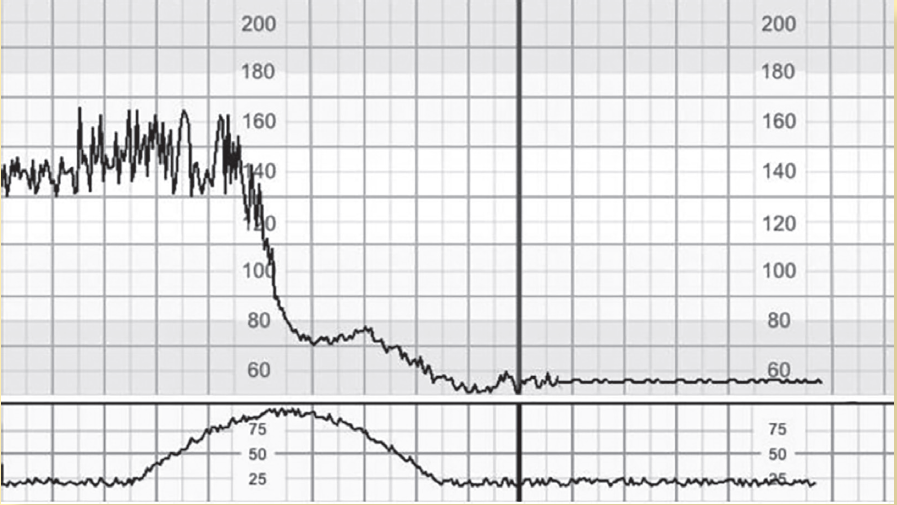 Figura 3 Registro cardiotocográfico con evidencia de contractilidad uterina, posterior a la cual se presenta caída brusca y significativa de la frecuencia cardiaca fetal sin recuperación de la misma, indicativo de compromiso en el bienestar fetal12.