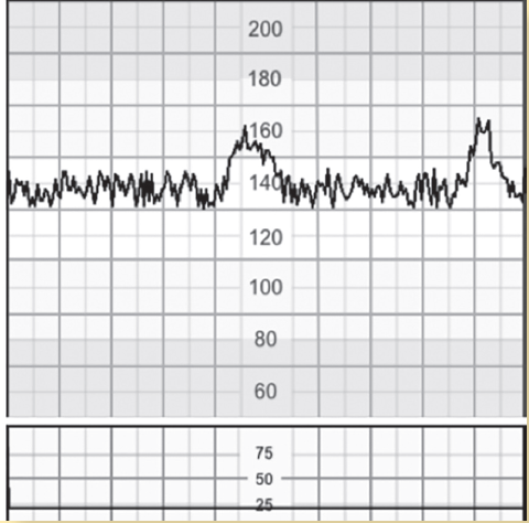 Figura 2 Registro cardiotocográfico sin evidencia de contractilidad, con FCF basal promedio de 130, con múltiples ascensos, sin descensos, ni espicas12.