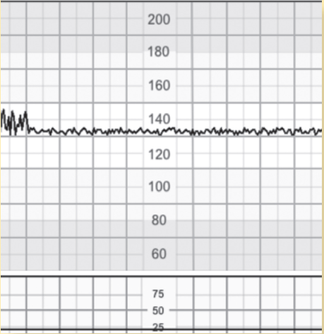 Figura 4 Registro cardiotocográfico con evidencia de contractilidad uterina, frecuencia cardiaca fetal basal de 140 latidos por minuto, con variabilidad disminuida (silente), sin ascensos ni descensos, indicativo de compromiso significativo en el bienestar fetal12.