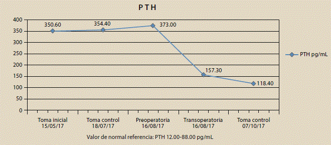 Figura 1 Mediciones séricas de parathormona a lo largo del abordaje diagnóstico, se muestra descenso en niveles séricos de PTH posterior a la resección del tejido afectado
