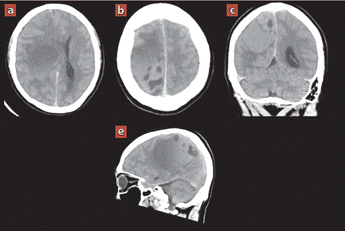 Fue valorado por el servicio de neurocirugía, quienes en la exploración neurológica encontraron funciones mentales conservadas, con disminución marcada de la fuerza muscular del hemicuerpo izquierdo, por lo que se solicitó tomografía de cráneo como abordaje diagnóstico inicial (figura 1).