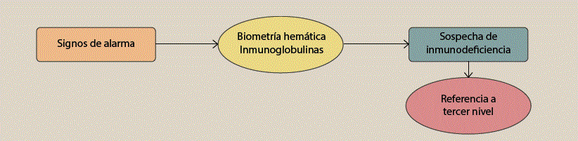En caso de sospecha de una inmunodeficiencia primaria se deberá enviar a la brevedad posible a un centro de tercer nivel de atención ya que algunos defectos congénitos del sistema inmune como la inmunodeficiencia combinada grave son una urgencia médica que requieren tratamientos especializados como trasplante de células pluripotenciales hematopoyéticas (TCPH) (figura 1).