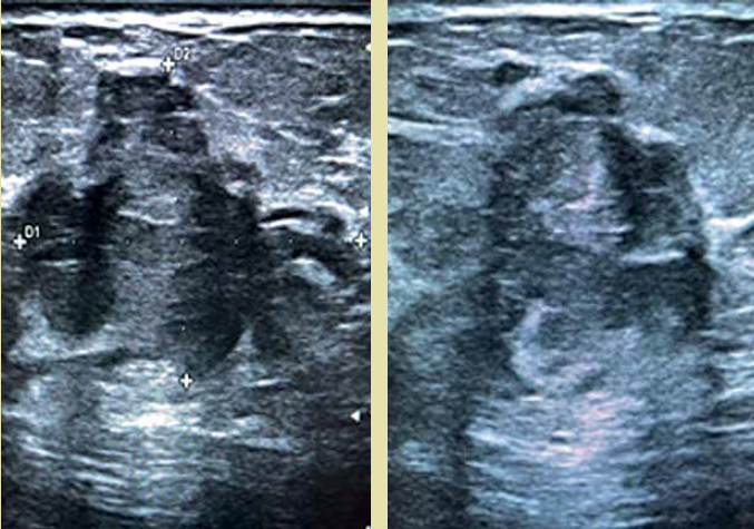 Figura 2 Ultrasonografía. Se evidencia lesión con bordes irregulares y espiculados, márgenes imprecisos, con tenue reforzamiento posterior y ecos internos.