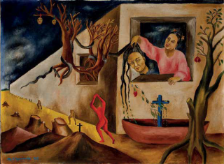 La obra Sueño y presentimiento Dream and Premonition, de 1947, es comúnmente conocida como la última de sus grandes obras. En esta pieza, la artista representa una visión de pesadilla donde se observa a sí misma mirando desde una ventana, sosteniendo en su mano una cabeza cortada con un rostro similar al suyo. El largo cabello de la cabeza decapitada se enreda entre raíces y ramas de árboles secos que se encuentran al lado de la ventana, mientras más cabezas cuelgan de ellos. Cuerpos decapitados corren hacia un paisaje árido, y las lágrimas de la cabeza decapitada gotean como hojas sobre un barco que sostiene una cruz. La escena está ambientada en colinas áridas y árboles muertos, creando un paisaje donde la artista contrasta los tonos ocres terrosos con un cielo azul oscuro sombrío y opresivo, muy diferente al uso característico de colores brillantes en sus otras pinturas.