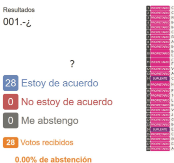 Figura 1 Pantalla en la que aparecen las opciones de votación y la lista que indica qué consejero ya votó (barra rosa), así como los suplentes que pueden hacerlo debido a la ausencia del consejero propietario (barra morada).