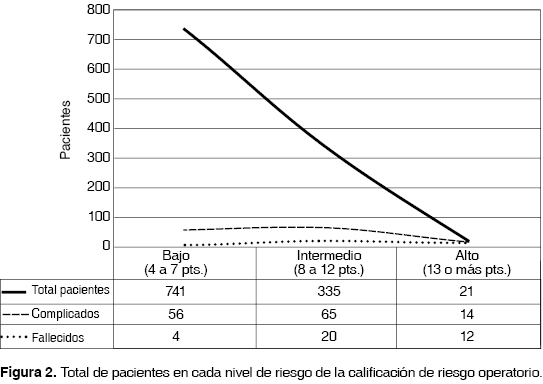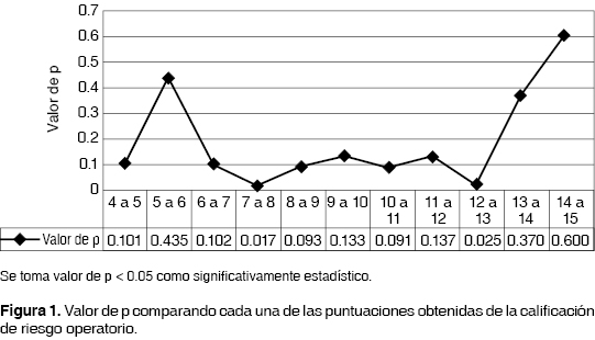 Se utilizaron los PARF, PRI, ThRCRI y la clasificación de la ASA realizando una sumatoria del resultado de cada índice, agrupándolos en un solo índice de riesgo llamado CARIOPE (tabla 5) dando un puntaje mínimo de 4 y máximo de 18, dividiéndolos en 3 grupos de riesgo (bajo, intermedio y alto). Se incluyeron a todos los pacientes sometidos a cirugía en el Servicio de Cirugía Torácica del Instituto Nacional de Enfermedades Respiratorias Ismael Cosío Villegas de la Ciudad de México, en el período comprendido de septiembre de 2010 a mayo de 2012, excluyendo pacientes en cirugía ambulatoria y aquellos a los que no fue posible dar el seguimiento durante los primeros 30 días posquirúrgicos. Los pacientes que resultaron con riesgo intermedio y alto fueron enviados a valoración preoperatoria y tratamiento preoperatorio por especialistas en medicina interna, cardiología y nefrología, principalmente. A las cirugías de urgencia también se les realizó la CARIOPE, y si las condiciones lo permitían también se interconsultó de manera urgente a la especialidad de medicina interna y terapia intensiva. El análisis de datos se realizó con el programa PASW statics v. 18 midiendo pruebas estadísticas para variables nominales y ordinales a través de Pearson Chi-Square y Fisher's Exact Test, tomando como significancia estadística una p menor a 0.05 y realizando tablas cruzadas y análisis univariados y multivariados. Para determinar los puntajes para cada nivel de riesgo de la CARIOPE se realizaron las mismas pruebas estadísticas que determinaron una p menor a 0.05 entre cada nivel de riesgo (figura 1), existiendo esta diferencia entre los puntajes 7 y 8 determinando el nivel de riesgo bajo e intermedio y entre los puntajes 12 y 13 determinando el nivel de riesgo intermedio y alto (figuras 1, 2 y 3). Se realizaron análisis estadísticos entre cada nivel de riesgo de CARIOPE comparándolas estadísticamente contra las complicaciones y mortalidad obtenidas. El estudio fue aprobado por el comité de ética en investigación de la institución.