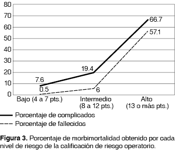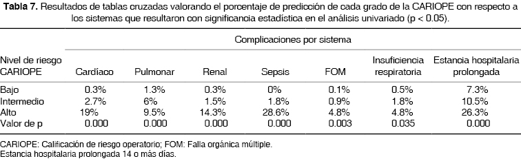 Los resultados por cada nivel de riesgo de la CARIOPE arrojaron una buena significancia estadística en la predicción de complicaciones y de la mortalidad (tabla 5), dando resultados de morbilidad del 7.6% y mortalidad de 0.5% en el nivel de riesgo bajo que corresponde de 4 a 7 puntos obtenidos por la sumatoria de los índices de riesgo pulmonar, cardíaco, renal y ASA; en el riesgo intermedio que corresponde de 8 a 12 puntos, la morbilidad fue de 19.4% y mortalidad de 6%; y en el riesgo alto que corresponde de 13 o más puntos, la morbilidad fue de 66.7% y mortalidad de 57.1%. El análisis estadístico entre cada nivel de riesgo arrojó una p < 0.001. Asimismo, se obtuvo una buena significancia estadística en la predicción de complicaciones en los siguientes sistemas por separado: pulmonares, cardíacas, renales, falla orgánica múltiple, insuficiencia respiratoria y sepsis (tabla 7).