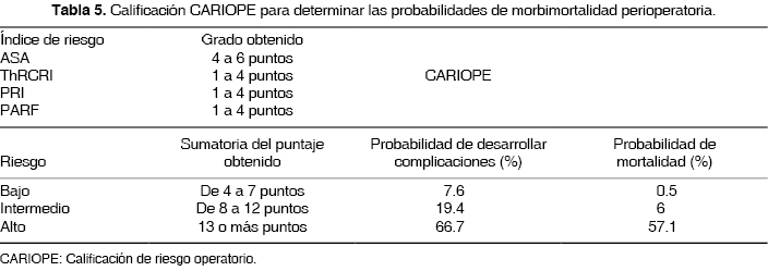 Nos dimos a la tarea de buscar en la literatura índices de riesgo en las áreas que presentan la mayor morbimortalidad, encontrando índices de riesgo pulmonar (PRI, del inglés pulmonary risk index [tabla 1]),11 índice de riesgo cardíaco revisado en cirugía de tórax (ThRCRI, del inglés thoracic revised cardiac risk index [tabla 2]),13 los predictores de falla renal aguda (PARF, del inglés predictors of acute renal failure [tabla 3])10 y la valoración de la Sociedad Americana de Anestesiología (ASA, del inglés American Society of Anesthesiologists [tabla 4]),14 las cuales son sencillas y fáciles de aplicar, además, pueden ser realizados por el personal médico quirúrgico sin necesidad de una interconsulta inicial por el especialista en medicina interna. Se realizó la sumatoria de la calificación de cada índice de riesgo descrito en una valoración única a la que llamamos Calificación de Riesgo Operatorio o CARIOPE (tabla 5).