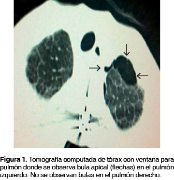 Presentó cuadro de disnea de inicio súbito, ansiedad y mareo. Durante el abordaje se evidenció neumotórax bilateral y sincrónico, de 15% en el hemitórax derecho y de 50% en el izquierdo. De manera inicial fue manejado con colocación de SEP y pleurodesis del lado izquierdo nada más. La SEP se mantuvo por 15 días debido a una fuga aérea persistente. Seis semanas después, presentó sintomatología inicial y nuevamente le fue diagnosticado NES izquierdo del 50%, situación para colocar SEP y realizar tomografía computada que documentó algunas bulas apicales bilaterales sin hallazgos relevantes en el resto del parénquima (figura 1). Se decide manejo quirúrgico.