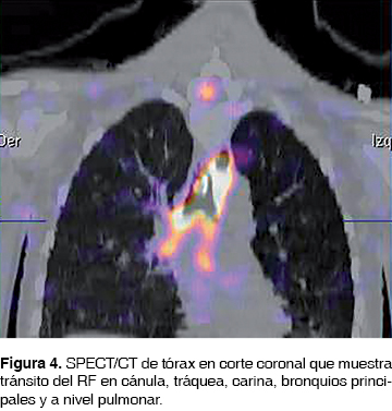 El salivogammagrama se realizó con .400 mCi/14.8 MBq de sulfuro coloidal marcado con 99mTc. Se obtuvieron imágenes dinámicas del proceso de deglución inmediatamente después de la administración oral del radiofármaco (RF), obteniendo imágenes cada medio segundo por 2 minutos, con una matriz de 128 x 128, con colimador de baja energía y alta resolución. Fue posible observar captación anormal del RF a nivel de la traqueostomía (figura 1). Ante este hallazgo se decidió realizar SPECT (del inglés single photon emission tomography), obteniendo una imagen tridimensional que muestra el trayecto del RF terminando en una bifurcación (figura 2). El estudio fue complementado con una tomografía computarizada (CT) para correlación anatómica. Al realizar la fusión SPECT/CT fue posible ubicar el RF en tráquea y ambos bronquios principales (figuras 3 y 4).