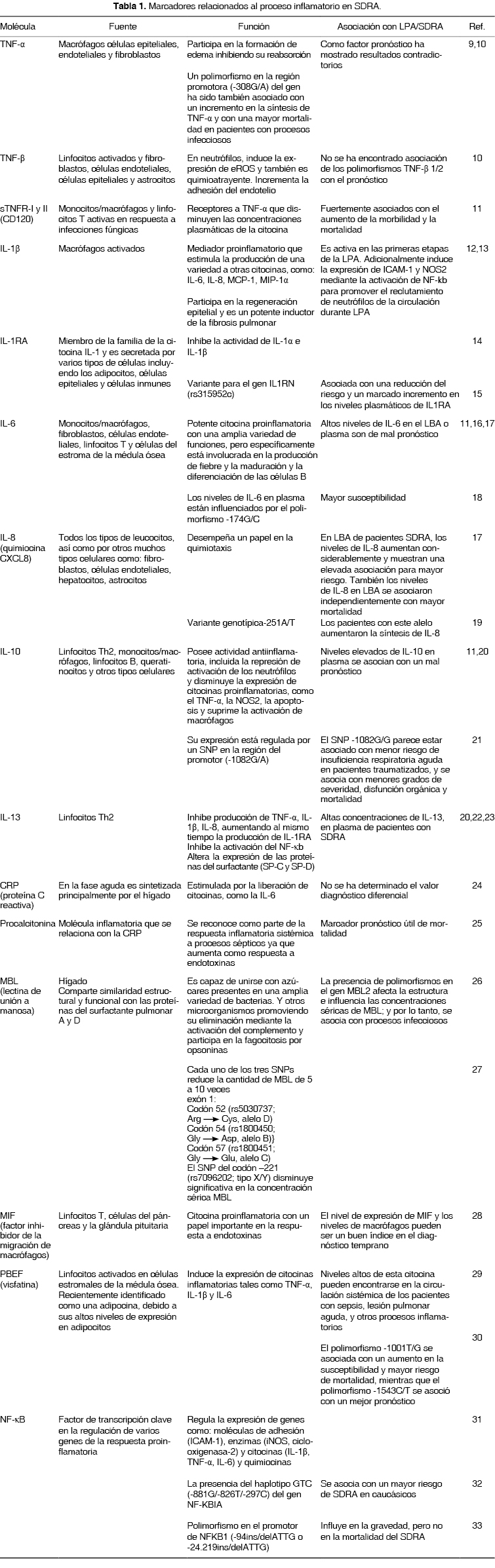 Es ampliamente aceptado que la formación de mediadores inflamatorios desempeña un papel importante en la fisiopatología del SDRA. Las moléculas que participan en este proceso son señaladas en la tabla 1. Es importante resaltar que, al presente, sólo unas pocas de ellas han sido validadas por estudios multicéntricos y no se ha podido encontrar ninguna que demuestre ser útil en la práctica clínica como biomarcador de susceptibilidad a SDRA.