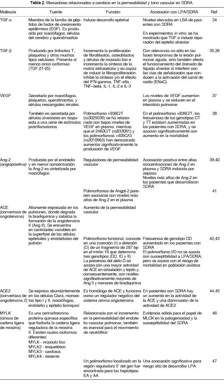 El endotelio microvascular pulmonar es un órgano metabólicamente activo esencial para mantener la homeostasis pulmonar y cardiovascular. Los estímulos dañinos comprometen la integridad estructural y funcional endotelial pulmonar, y conducen a la formación de edema pulmonar no cardiogénico e inflamación parenquimal. Así, el endotelio pulmonar tiene un papel clave en el desarrollo de la LPA y el SDRA. Las moléculas que se asocian con alteraciones en el endotelio microvascular se muestran en la tabla 4.