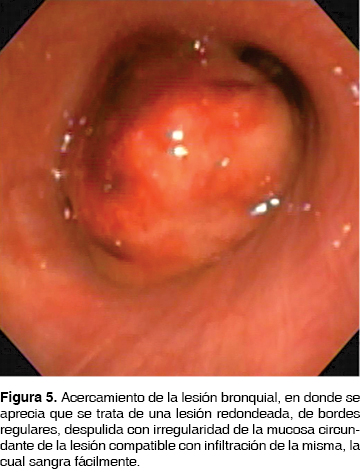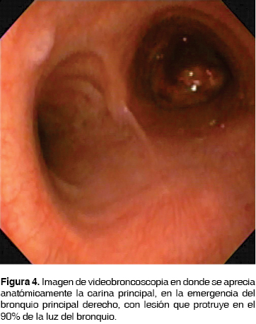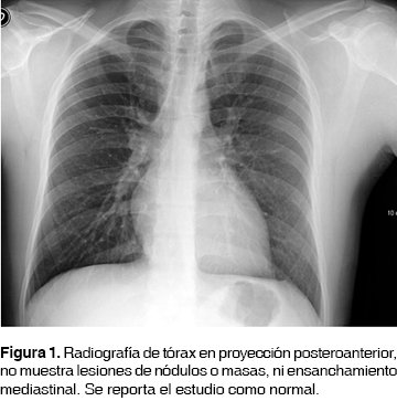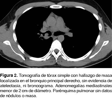 Paciente masculino de 37 años, con antecedentes de asma durante la infancia; presentó un neumotórax derecho espontáneo primario hace 15 años, tratado con colocación de sonda pleural por cuatro días, secundario a bulas congénitas. Hace cinco años funduplicatura de Nissen (360o) sin complicaciones. Previo a su ingreso al hospital presentó disnea de grandes a medianos esfuerzos, sibilancias audibles a distancia, motivo por el que se le realiza radiografía de tórax en proyección posteroanterior (figura 1), siendo reportada como normal; se inicia tratamiento con bromuro de ipatropio/salbutamol y ceftriaxona, con mejoría parcial del cuadro. A los tres días de haber iniciado el tratamiento presenta tos con escasos hemoptoicos intermitentes, situación por la que asiste a urgencias en donde se le realiza tomografía simple de tórax (figura 2) con presencia de una masa a nivel del bronquio principal derecho, así como presencia de adenomegalias mediastinales.
