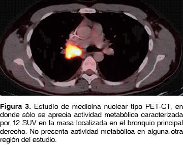 Bazot et al.5 en su serie establecieron que los hallazgos radiológicos habituales en el linfoma primario pulmonar se aprecian como una ocupación alveolar en el 50-90% de los casos, con un diámetro menor de 5 cm y con un borde bien delimitado; la serie reporta hasta un 50% de los casos con presencia de broncograma aéreo. La tomografía computada, estudio que cuenta con mayor sensibilidad, ha demostrado que las lesiones son bilaterales (60-70%) y múltiples (70-77%). Menos del 10% de los pacientes tienen opacidades reticulonodulares difusas bilaterales, atelectasias o derrame pleural. En nuestro estudio, en la tomografía de tórax y como complemento del PET-CT, sólo se definió la presencia única de una masa en bronquio principal derecho.