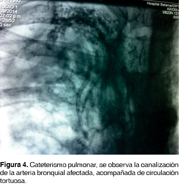La embolización de arterias bronquiales es uno de los tratamientos más usados en hemoptisis de diferentes etiologías, incluyendo tuberculosis, bronquiectasias, aspergilosis, fístula aortobronquial y fibrosis quística. Con ésta se logran disminuir las comorbilidades que se presentan al exponer a estos pacientes a tratamientos quirúrgicos;22 las principales contraindicaciones para embolización arterial incluyen: coagulopatía incorregible, falla renal y reacción alérgica severa a los medios de contraste. Luego de la embolización arterial, la tasa de recurrencia es de aproximadamente 50% en los cuatro primeros meses y muchos casos requerirán nueva embolización, la cual puede llevarse a cabo hasta tres veces en el mismo episodio; después, se recurrirá a otras opciones terapéuticas si el sangrado perdura. La eficacia general para el control inicial de la hemoptisis después de una embolización es cercana al 75%, aumenta al 89% después de dos embolizaciones y es del 93% después de tres.23