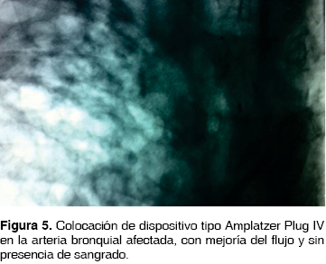 ABSTRACT. The haemoptysis is a complication commonly reported in patients diagnosed with cystic fibrosis and affects approximately 9% of the population. It may be in limited quantity to massive events that threaten the patient's life. Its pathogenesis is complex, but the most commonly accepted cause is persistent airway inflammation associated with neovascularization with damage to the vasculature of the bronchial arteries. The case of a 22 year old with confirmed diagnosis of cystic fibrosis in whom control of hemoptysis was achieved through embolization of bronchial arteries and placement PLUG IV Occluder device percutaneously successfully described.