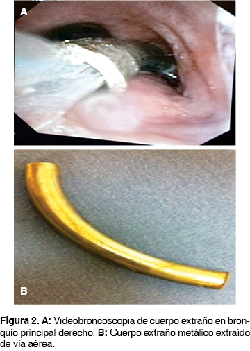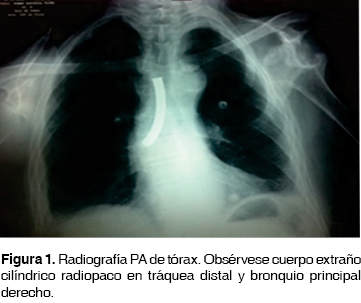 Se realizó radiografía de tórax donde se observó cuerpo extraño radiopaco alojado en la tráquea distal y en bronquio principal derecho (figura 1).
