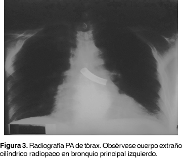 En la radiografía de tórax podía observarse cuerpo extraño radiopaco alojado en bronquio principal izquierdo (figura 3).