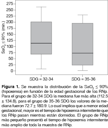 En nuestro país (Ciudad de México -2,240 msnm-) no hay investigaciones sobre la normoxia en RNp; sin embargo, se han reportado saturaciones entre 88-93% en alturas mayores a los 2,000 msnm en RN de término, sanos, durante los primeros cuatro meses de vida, muy cercanos a los límites de desaturación (SO2 < 90%) incluso, a mayor altura (3,000 msnm) alcanzando niveles de desaturación menores a 90%.30 En nuestra muestra la mediana del porcentaje de SaO2 promedio fue de 93.5%. Estos niveles de saturación en la altura se convierten en una desventaja durante el sueño y se traducen en un mayor riesgo de hipoxemia asociado a las diferentes pausas respiratorias presentes al dormir, cuando éstas se asocian a desaturación.