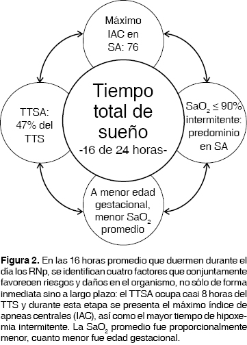 Este trabajo confirma que para nuestra muestra de RNp, los primeros meses de vida son importantes para su desarrollo, si consideramos el tiempo que pasan dormidos durante este período de vida posnatal, y la velocidad de cambios biológicos que suceden durante el sueño, donde no sólo toman lugar los cambios esperados en el proceso de maduración del organismo, sino aquéllos que se tornan en factores de riesgo en la vida del niño, tanto a corto como a largo plazo. En la figura 2 resumimos los cuatro hallazgos de nuestro estudio respecto del sueño nocturno de RNp (con apneas asociadas a desaturación de oxígeno) que, ubicados en el TTS que duerme un RN, resultan en una combinación que coloca en riesgo al bebé durante la noche. Realizar registros PSG nocturnos a RNp no hospitalizados no es una práctica común en la medicina del sueño, menos aún en aquellas disciplinas y especialidades implicadas en el desarrollo neonatal e infantil, de aquí que nuestros resultados posibiliten líneas de investigación a largo plazo y considerando muestras mayores que nos permitan diferenciar sus condiciones de apnea para no considerar esta población como homogénea; y que cualquiera que sea el origen de la hipoxemia, los estudios longitudinales nos permitan evaluar el impacto que ésta pueda tener en el desarrollo físico y cognitivo del niño.