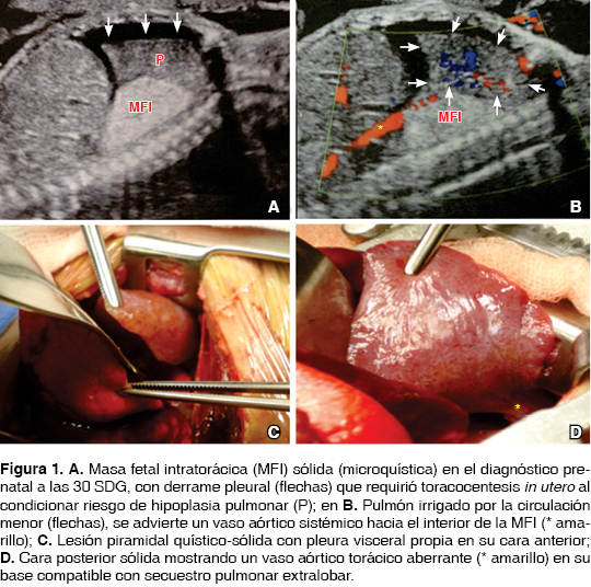 Caso 1. Feto de 30 semanas de gestación (SDG) con diagnóstico prenatal de masa intratorácica sólida y posterior recibió irrigación aberrante de la aorta torácica y cursó con derrame pleural, que al condicionar riesgo de hipoplasia pulmonar se le realizó toracocentesis única intrauterina del hemitórax izquierdo obteniéndose 20 mL de trasudado amarillo con polimorfonucleares en 80%, cariotipo normal, cursando posteriormente sin hidropesía fetal y sin desviación mediastinal, sin placentomegalia y sin datos de preclampsia o síntomas maternos de alarma, cantidad de líquido amniótico normal. Se obtiene producto masculino de término y asintomático, en la evaluación radiológica posnatal por angiotomografía se documenta un vaso sistémico anómalo tributario de la aorta torácica irrigando la lesión sólida sin datos de involución ni regresión. A los 5 días de vida se decide por minitoracotomía izquierda la resección de una masa de apariencia lingular sólido-quística con pleura visceral propia, se realiza el control vascular con corte y sutura de su vaso aórtico torácico aberrante compatible con secuestro pulmonar extralobar, se retira el drenaje pleural a las 24 h del posquirúrgico y egresa con evolución satisfactoria (figura 1).