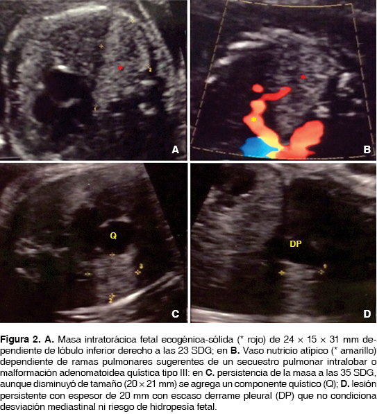 Caso 2. Feto de 23.1 SDG con una masa ecogénica en el lóbulo inferior del pulmón derecho recibiendo irrigación de un vaso nutricio aparentemente tributario de las ramas pulmonares de 24 × 15 × 31 mm, sin datos de derrame pleural ni desviación mediastinal y sin morbilidad materna presente. En un control ultrasonográfico posterior a las 35.1 SDG persiste la masa ecogénica con un componente quístico agregado de 20 × 15 × 20 mm con aparente disminución de tamaño, pero persistiendo con la misma irrigación aberrante ya descrita compatible con secuestro pulmonar intralobar y probable malformación adenomatoidea quística, sin desplazamiento mediastinal y con una relación lesión/circunferencia cefálica (CVR) de 0.1 traduciendo riesgo bajo de desarrollar hidropesía fetal, sin datos de morbilidad materna (figura 2).