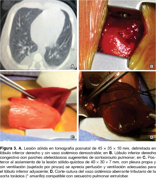 Se obtiene neonato de término y asintomático, en la evaluación radiológica posnatal con tomografía se advierte una lesión sólida posterior de 45 × 35 ×10 mm, triangular y basal del pulmón derecho sin componente quístico y sin irrigación anómala aparente, la evaluación ecocardiográfica expone una comunicación interauricular tipo foramen oval de 4.7 mm con cortocircuito de izquierda a derecha sin repercusión clínica evidente. Por la persistencia de la lesión con incremento en su tamaño y por la presencia de cortocircuito pulmonar con saturaciones de 90% que mejoraban con aporte de oxígeno hasta 94% se decidió realizar a los 3 días de vida minitoracotomía derecha encontrándose: lóbulo inferior derecho con zonas de congestión y atelectasia que experimenta mejoría posterior a la separación y liberación de una masa de apariencia piramidal de 4.0 × 3.0 × 0.7 cm sólido-quística con pleura visceral propia, se realiza el control vascular con corte y sutura de su vaso aórtico torácico aberrante incrementado la saturación a 98% compatible con secuestro pulmonar extralobar con cortocircuito pulmonar, se retira el drenaje pleural a las 24 h del posquirúrgico y egresa con evolución satisfactoria (figura 3).
