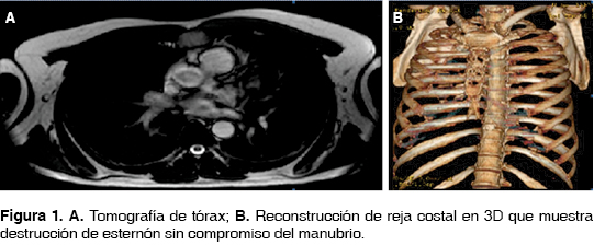 Presentamos el caso de un hombre de 55 años, sin otros antecedentes, con cuadro de dos años de dolor esternal; tres gammagrafías realizadas en este período reportan proceso inflamatorio esternal que no mejora; posterior a tomografía de tórax y a reconstrucción tridimensional de la reja costal (figura 1), se muestra una masa de aspecto inflamatorio en cuerpo esternal. La biopsia incisional reporta un plasmocitoma esternal. Los niveles séricos de IgG, IgM e IgA, y cadenas livianas de kappa y lambda resultaron negativos, por lo que se descartó el mieloma múltiple. Debido al diagnóstico y la destrucción por compromiso tumoral del cuerpo esternal se decide resección con preservación de manubrio y reconstrucción con un sistema de fijación de barras de titanio, así como el uso de malla biológica.