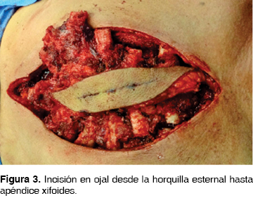 Se efectuó incisión en ojal que va desde la horquilla esternal hasta el apéndice xifoides, dejando márgenes sobre la incisión previa de la biopsia (figura 2); se disecó por planos hasta llegar a reja costal, desinsertando el pectoral mayor de los arcos costales en vecindad con cuerpo esternal. Se realizó resección del cuerpo esternal en la unión costocondral bilateral, liberándolo de distal a proximal hasta el tercer arco costal, preservando el manubrio y extrayendo el cuerpo (figuras 3 y 4).