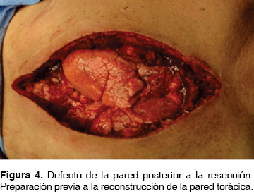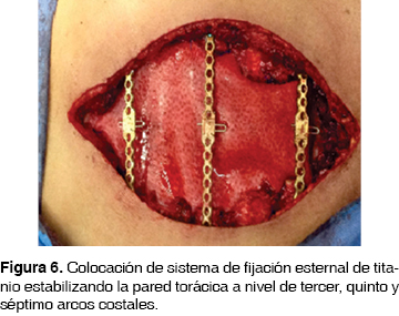 Posteriormente se realizó reconstrucción del defecto de pared torácica, con colocación de malla biológica de dermis de cerdo (XCM™ biológica Synthes©) (figura 5), fijándola con puntos separados de prolene 2-0. Se estabilizó pared torácica con sistema de fijación esternal de titanio (Synthes Matrix Rib©) a nivel del tercer, quinto y séptimo arcos costales, permitiendo la fijación y estabilización de la pared del tórax (figura 6). Se liberan colgajos del músculo pectoral mayor, rotándolos a línea media, cubriendo en su totalidad la prótesis (figura 7).