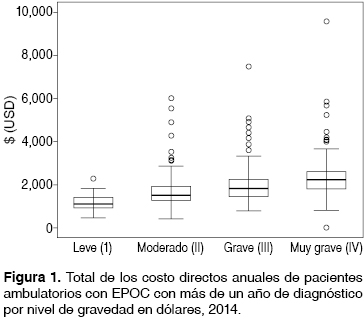 ABSTRACT. Background: The PLATINO study developed in Mexico City (2003) showed a COPD prevalence of 7.8% in individuals 40 years of age and older. In Mexico, there is no published information concerning direct and indirect health related costs for patients with COPD. Objective: To measure direct and indirect costs of outpatients with COPD at a tertiary-level hospital in Mexico. Material and methods: We recruited outpatients with diagnosis of COPD during one year. At base-line interview we asked about out of pocket health expenses for the last year previous to enrollment. Costs for the hospital were registered as well. For this study, we analyzed costs in 2014 US dollars for the last year previous enrollment in patients with > 12 months of being diagnosed stratified by GOLD categories. Results: We enrolled 611 outpatients with COPD, of whom 483 had a time of diagnosis > 12 months. The medians of annual direct costs to patients by GOLD were: $1,116, mild; $1,533, moderate; $1,825, severe, and $2,245, very severe. The differences among the medias of annual direct cost were statically signified (p < 0.01). Conclusions: Direct out of pocket costs increased with COPD severity and were due to drugs, oxygen, and accommodations mainly. It is important to have a standardized methodology to make the results comparable.