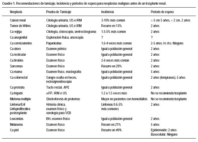 En el cuadro 1 se describen las principales neoplasias con su método de tamizaje propuesto, su incidencia (anotando el porcentaje de incremento en pacientes con terapia sustitutiva de la función renal o tasas de recurrencia postrasplante) y el tiempo de espera libre de tumor antes de aceptarse la realización de un trasplante renal.9 Como puede verificarse en el cuadro, los métodos de tamizaje para el diagnóstico oportuno de las neoplasias en esta población de pacientes son los mismos que los propuestos para la población general.