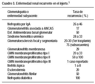 Es la causa de 20 a 40% de insuficiencia renal en pacientes trasplantados. Ocurre en 6 a 19.4% de todos los trasplantes renales. La glomerulonefritis membranoproliferativa tipo II es de las glomerulopatías que tiene mayor tasa de recurrencia, seguida de la glomerulopatía por IgA y de la glomeruloesclerosis focal y segmentaria.39 En el cuadro 3 describimos algunas de las nefropatías o enfermedades recurrentes seguidas de su tasa de recurrencia.