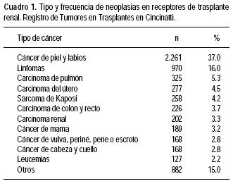 Este incremento en la frecuencia de cáncer no se observa en todas las neoplasias. Según los datos del Registro de Tumores en Trasplantes de Cincinatti,4 las dos neoplasias con mayor incidencia son los desórdenes linfoproliferativos y el cáncer de piel (Cuadro 1), mientras que las neoplasias más comunes para el grupo de edad, como el cáncer de pulmón, cáncer de mama, y de tubo digestivo, no se encuentran incrementadas en frecuencia e incluso disminuyen después del trasplante.