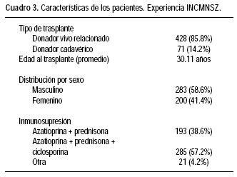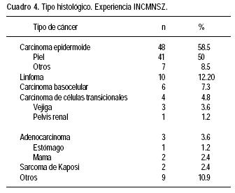 En nuestro Instituto realizamos un estudio retrospectivo encaminado a encontrar la frecuencia, tiempo de latencia, tipo histológico y evolución de las neoplasias malignas desarrolladas en pacientes trasplantados renales entre enero de 1972 y diciembre del 2000. En este periodo fueron analizados 499 trasplantes realizados en 483 pacientes. Las características de los pacientes trasplantados se encuentran en el cuadro 3. Durante un seguimiento promedio de 7.28 años, 40 pacientes (8.28%), 28 hombres, 12 mujeres, desarrollaron 82 neoplasias malignas. El promedio de edad al diagnóstico de cáncer fue de 35.8 años. Los regímenes de inmunosupresión utilizados fueron: prednisona/azatioprina en 21 pacientes (52.5%) y prednisona/azatioprina/ciclosporina en 19 pacientes (47.5%). Los tipos histopatológicos más frecuentes fueron carcinoma epidermoide 58.5% (48/82), y linfomas 12% (10/82) (Cuadro 4). El sitio más frecuente fue piel. El tiempo de latencia (el tiempo transcurrido entre el trasplante y el desarrollo de la neoplasia) fue de 79 meses (6240) en el grupo total. La latencia para linfomas fue de 55 meses, para cáncer epidermoide de piel de 80.5 meses y para otros tumores sólidos de 66 meses. En relación con el esquema inmunosupresor, el de tres drogas tuvo una latencia de 61.95 meses vs. 104.14 para el de dos drogas siendo la diferencia estadísticamente significativa (p = 0.01). Por tipo histológico también encontramos diferencias en la latencia con el uso de dos o tres drogas inmunosupresoras, principalmente en linfomas: 55 ± 39.09 meses para tres drogas vs. 74.75 ± 27.58 meses para dos drogas, sin embargo, la diferencia no fue significativa (p = 0.188).