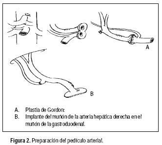 En casi 40% de los casos, la arteria hepática derecha o la izquierda tienen variantes en cuanto a su origen y siempre deben ser conservadas, cualquiera que sea su calibre.14,15 Si la arteria hepática izquierda nace de la arteria gástrica izquierda que proviene del tronco celíaco, se preparará ligando la rama con destino gástrico y preservando la rama hepática. Si ésta nace directamente de la aorta, debe incluirse junto con el tronco celíaco en el parche de aorta. La arteria hepática derecha nace, la mayoría de las veces, de la arteria mesentérica superior, lo que condiciona que el pedículo hepático incluya dos arterias separadas que conviene unir durante la preparación "ex vivo". Se han publicado numerosas técnicas de reconstrucción, sin embargo, la técnica habitualmente utilizada16 consiste en anastomosar el tronco celíaco y el origen de la arteria mesentérica superior. Cuando el origen de esta última no se ha podido extraer, se puede reimplantar la arteria hepática derecha en el muñón de la arteria esplénica o de la arteria gastroduodenal16 (Figura 2).