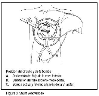 ° Colocación del shunt venovenoso. Para su utilización se pinzan y canulan la vena safena derecha, la vena axilar izquierda y la vena porta. El tronco portal se cánula en su origen y luego se secciona al ras de su bifurcación, tras haber ligado sus ramas derecha e izquierda. Se unen los extremos distales de las cánulas de la safena y de la porta con la ayuda de un dispositivo en Y. Este dispositivo y la cánula axilar se conectan al circuito extracorpóreo, se liberan los pinzamientos y se pone en funcionamiento la bomba (Figura 3). Su flujo puede someterse a variaciones considerables sin consecuencias hemodinámicas (1.52 L/ min.) siempre que la vena cava inferior no esté pinzada con un clamp.
