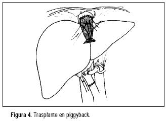 ° Técnica de trasplante en piggyback. El término "Piggyback" fue acuñado para ilustrar la manera de llevar a alguien "a cuestas". La técnica quirúrgica de trasplante conocida con este nombre se caracteriza por conservar la continuidad de la vena cava del receptor para implantar en ella un segmento de vena cava del injerto que contiene el ostia de las venas hepáticas (Figura 4). Las ventajas técnicas de esta modalidad fueron descritas inicialmente por Starzl17 y caracterizadas recientemente por Moreno.18 Starzl argumentó en pro de su uso, una disminución en el riesgo de estenosis y fallas técnicas asociadas a la confección de dos anastomosis con la vena cava inferior según la técnica estándar y los resultados de Moreno, et al. muestran una disminución en el sangrado transoperatorio y en los requerimientos transfusionales17,18 sin comprometer en ambos casos las tasas de éxito obtenidas con la técnica tradicional.1,9