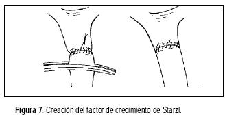 ° Anastomosis de la vena porta. El restablecimiento del flujo portal sólo es posible tras haber liberado la vena porta del receptor de la bomba de circulación. Para ello se procede a quitar la cánula del tronco portal y a presentar ambos extremos (donadorreceptor). La anastomosis debe quedar tensa para no correr el riesgo de torsión cuando se aflojen los separadores. Se realiza la anastomosis mediante sutura continua de polipropileno 6/0. El nudo de la sutura se confecciona a distancia de la anastomosis, ofreciéndole una posibilidad de expansión cuando sea apretado en el momento del desclampaje (Figura 7). Es el "growth factor" descrito por Starzl.19 Una vez concluidas las anastomosis venosas, se libera primero la vena porta, inmediatamente después se libera la vena cava infrahepática y posteriormente la suprahepática. Es necesario asegurarse de que no existen fugas en las anastomosis o en el injerto. Se debe asegurar que la sutura continua de la vena porta esté tensa y que la hemostasia sea correcta en los tejidos que rodean los elementos del pedículo.