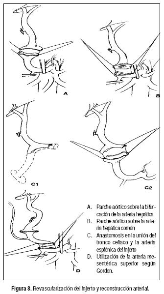 El parche aórtico del injerto no es siempre utilizable, especialmente debido a lesiones ateromatosas. En estos casos la arteria del injerto se llevará, si es posible, a la unión del tronco celiaco y de la arteria esplénica, cuando ésta no ha sido extraída (Figura 8). Cuando la arteria hepática del receptor es inutilizable por una trombosis o porque sus paredes han sido disecadas por un hematoma intramural. La zona de la anastomosis incluirá a la arteria esplénica (Figura 8). El eje arterial del injerto es suficientemente largo para ser implantado sin tener que recurrir a la interposición de un injerto vascular.