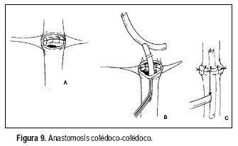 ° Anastomosis colédococolédoco. Es la técnica indicada cuando los extremos del colédoco están sanos, son amplios, bien vascularizados y suficientemente largos para permitir una anastomosis sin tensión, en caso contrario tendremos que recurrir a una anastomosis biliodigestiva. Cualquiera que sea la técnica escogida, el primer tiempo incluye la realización de una colecistectomía del injerto. La hemostasia del lecho vesicular, las ligaduras de la arteria y del muñón cístico deben ser perfectas. La anastomosis colédococolédoco se realiza con puntos simples de monofilamento reabsorbible 5/0, algunos grupos colocan una sonda en T como férula de esta anastomosis, mientras que otros prefieren no dejarla (Figura 9).