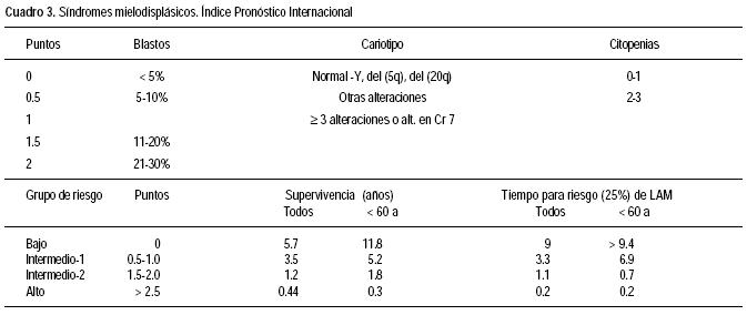 Dado que el curso clínico de los SMD es muy variable, una valoración precisa del pronóstico es esencial antes de decidir un tratamiento, particularmente en cuanto a llevar a cabo o no un TCPH. Actualmente el Sistema del índice Pronóstico Internacional (IPSS, por sus siglas en inglés) es el instrumento, a este respecto, de mayor utilidad en los SMD (Cuadro 3).