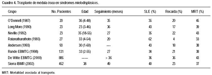 En una revisión reciente hecha por Benesch y Deeg,1 que incluyó 31 estudios publicados de 1990 a 2002, la supervivencia libre de recaída (SLR) fue de 874%, con una frecuencia de recaída de 071% y una mortalidad no asociada a recaída (MNAR) de 2872%. Las principales series de TCPH en SMD se muestran en el cuadro 4.