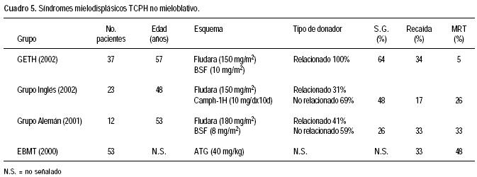 El sustento teórico de estos trasplantes es que una reducción en la intensidad del acondicionamiento reduce la toxicidad/mortalidad y por otro lado que la administración de drogas predominantemente inmunosupresoras en el acondicionamiento facilita el injerto de la MO trasplantada y el consiguiente efecto de injerto contra leucemia, linfoma o neoplasia. En vista del grupo de edad en que se presentan los SMD, este tratamiento es particularmente atractivo en este subgrupo de pacientes, existiendo, sin embargo, escasa información de su utilidad (Cuadro 5).