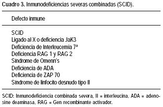 Las inmunodeficiencias combinadas severas son un grupo heterogéneo de desórdenes congénitos letales de los linfocitos B y T que tienen como resultado la falla de los linfocitos T para responder ante mitógenos, células alogénicas y antígenos específicos, con deficiencia de las células B para producir anticuerpos específicos.5,6 Los niños con este grupo de enfermedades se han clasificado6 de acuerdo con el fenotipo y la función de los linfocitos circulantes, la forma de herencia y la presencia o deficiencia de alguna enzima, en: