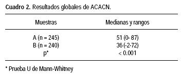 Se incluyeron los 31 grupos de la asignatura de patología orgánica de la UNAM. La muestra de alumnos que ya habían cursado la materia (A) resultó de 245 y de 240 la de los que no lo habían hecho (B). En el cuadro 1 se muestra la distribución de los estudiantes en lo explicable por azar o en algán grado de desarrollo de la ACACN, de acuerdo con la puntuación obtenida al contestar el cuestionario. Se puede observar que los de la muestra A se distribuyen con predominio en los grados Bajo e Intermedio, mientras que los de la B se ubican, preferentemente, en los grados Muy bajo y Bajo. Asimismo, se puede notar que en la muestra A 34.5% de los alumnos se encuentra en los grados Intermedio y Alto, mientras que en la B, sólo 5% alcanza el grado Intermedio. Tal diferencia en la distribución de frecuencias es significativa (p < 0.0001). Al contrastar los resultados globales (Cuadro 2), la mediana de A resultó de 51, significativamente mayor que la de la muestra B, que fue de 36 (p < 0.001).