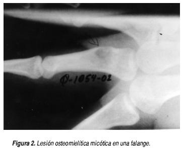 Esta enfermedad causada por el hongo Coccidioides immitis, es primariamente pulmonar y la diseminación ocurre en 1% o menos de los casos.6,7 La piel, las meninges y el sistema esquelético son los sitios más frecuentemente afectados en los procesos diseminados.8,9 De hecho la lesión ósea está presente en 1050% de los casos diseminados10 y puede ser monostótica o poliostótica. Las localizaciones óseas más frecuentes son la columna vertebral, los huesos del cráneo, los huesos de manos y pies, la tibia y el fémur (tercio distal) y la pelvis. Las lesiones afectan principalmente la metáfisis y epífisis de huesos largos, pero la diáfisis puede estar comprometida en los huesos cortos de las manos y pies. La lesión articular está constituida por proyecciones papilares con células espumosas y macrófagos con hemosiderina, similar a la observada en la sinovitis villonodular y puede involucrar al cartílago articular y al hueso. Los tejidos blandos periarticulares pueden participar como sitios primarios de infección o estar secundariamente afectados por lesiones articulares y óseas que producen trayectos fistulosos.11