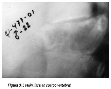 Clínicamente la patología micótica involucraba únicamente la articulación en siete casos (37%). La articulación de la muñeca fue la más afectada. En estos casos, la imagen radiológica no mostraba lesiones óseas. En 12 pacientes (63%) había afectación ósea, con imágenes básicamente líticas excepto en un caso. Las lesiones eran compatibles con osteomielitis (Figura 2) o bien eran lesiones destructivas en sacabocados que simulaban metéstasis. Los huesos más afectados fueron las vértebras (Figura 3), especialmente dorsolumbares en sus elementos posteriores, la rótula y el maxilar inferior.