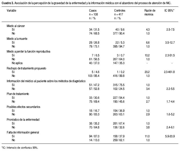 Los principales motivos expuestos para abandonar el proceso de atención fueron miedo al cáncer (OR = 4.3), miedo a la muerte (OR = 6.6) y miedo a perder la función reproductiva (OR = 10.2), resultados que fueron estadísticamente significativos (Cuadro 3). Por otro lado, una fuerte asociación con el abandono se observó en pacientes que no aceptaron el tratamiento propuesto (OR = 20.2; 2.3461.8).